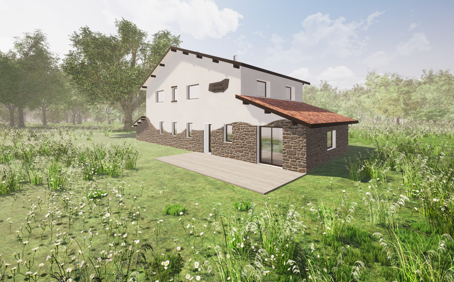 Ostau Granje est une maison traditionnelle rénovée et affirmée. Conçue pour abriter la vie d'une famille nombreuse de 7 personnes, elle est pensée pour proposer un habitat 100 % modulaire, permettant de suivre les évolutions de vie de ses occupants sur le long terme. Ostau Granje retrace l'histoire d'une vieille ferme traditionnelle qui a connu de nombreuses modifications et scénarios de vie différents. C'est une maison qui parle de famille, de culture et de refuge animalier. Elle s'inscrit ainsi dans son environnement de manière très humble et culturelle. Elle se pare avec modernisme de façades landaises brunies à galets maçonnés. Visant l'autonomie alimentaire partielle, elle se dote d'un potager et d'un verger pour viser l'économie alimentaire en circuit court. Inscrite dans un territoire agricole, elle s'intègre dans les notions de partage, de proximité, de solidarité et d'altruisme. Elle est située près d'un lavoir et de terrains équestres, qui lui confèrent son charme. La maison cherche à faire apparaître sur ses murs l'histoire de son vécu, et son apparence à la fois moderne et traditionnelle, respectant sa typologie d'origine, lui permet de s'inscrire comme un marque-page dans l'histoire de sa construction.